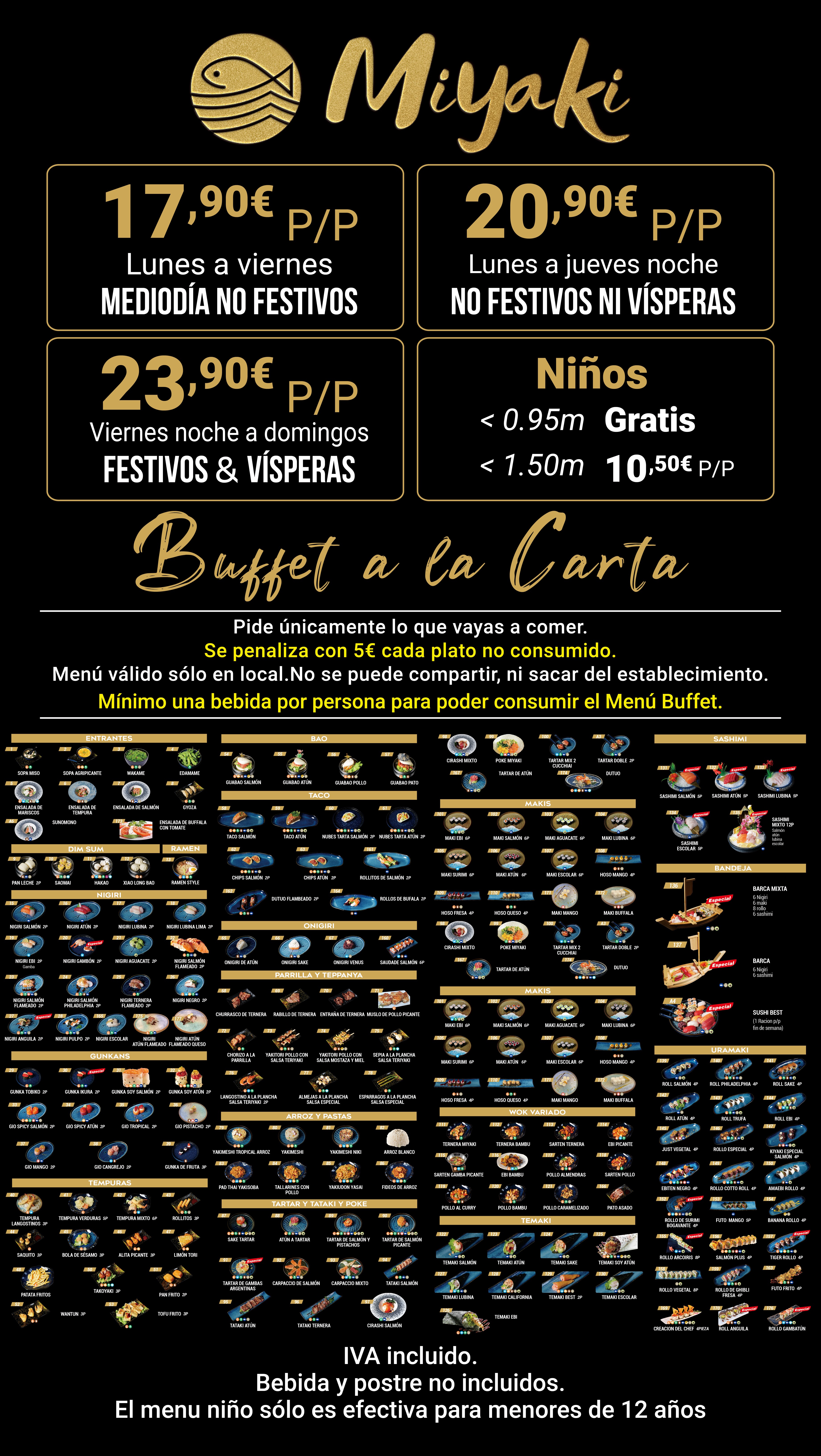 En Miyaki, te invitamos a disfrutar de una experiencia de sushi sin límites con nuestro servicio de sushi buffet. Sumérgete en un festín de sabores donde puedes deleitarte con una amplia variedad de opciones, desde los clásicos hasta las creaciones innovadoras de nuestros chefs. Ya sea que seas un experto en sushi o estés explorando esta deliciosa cocina por primera vez, en Miyaki encontrarás algo que satisfará todos tus antojos.